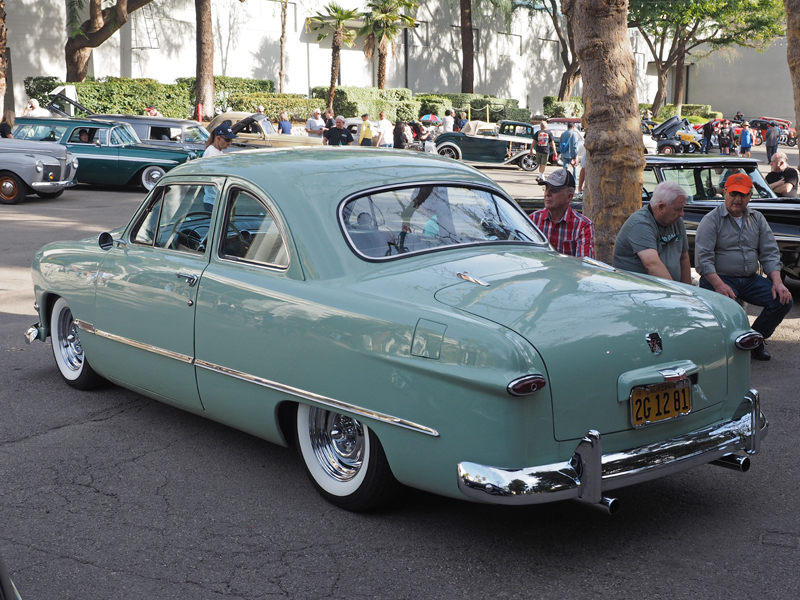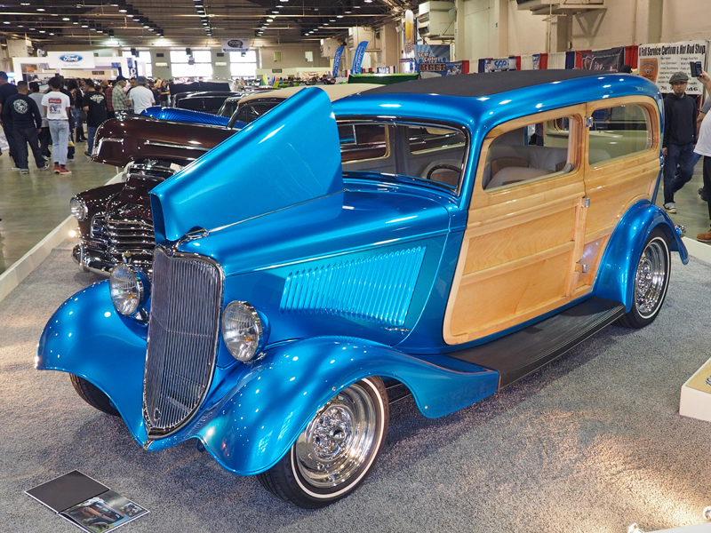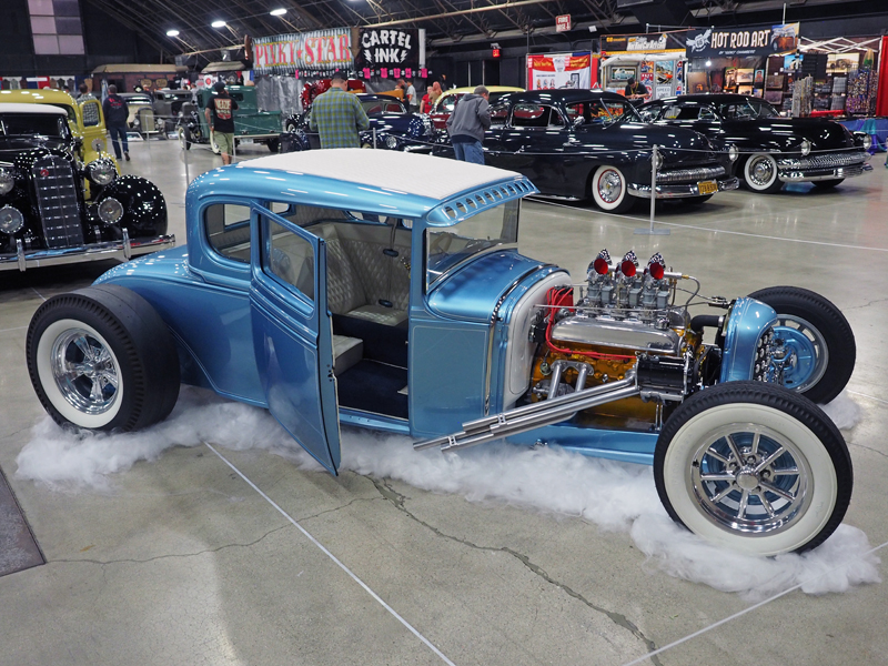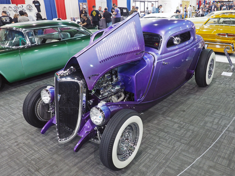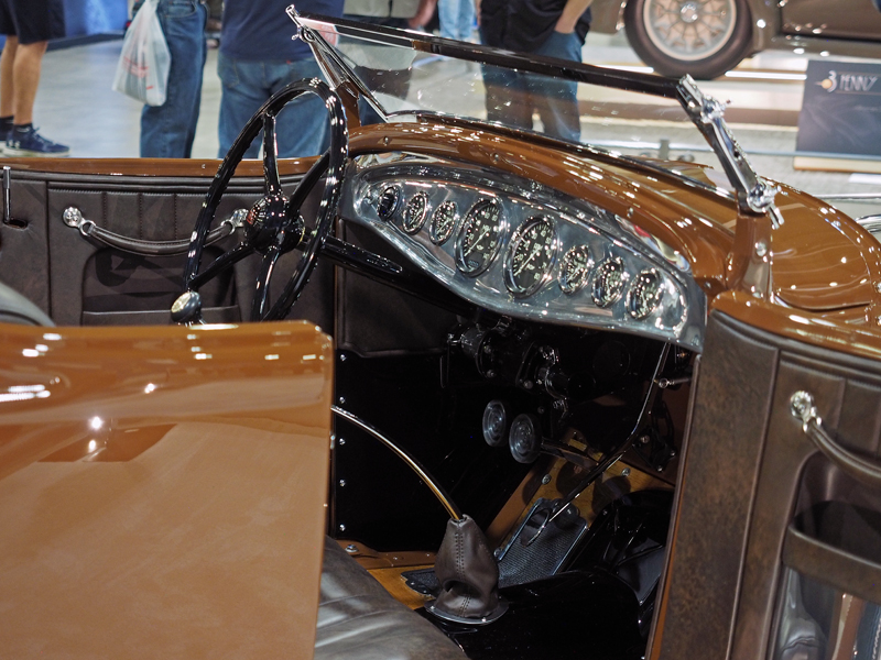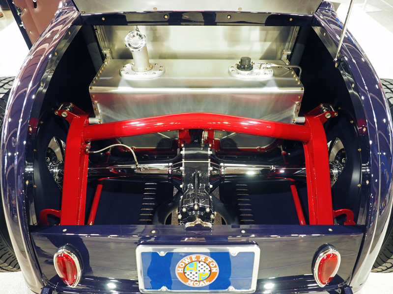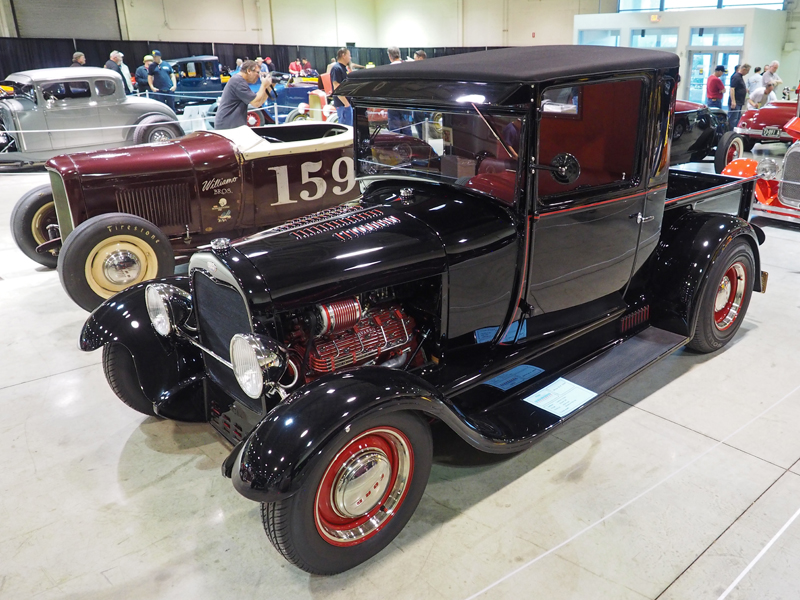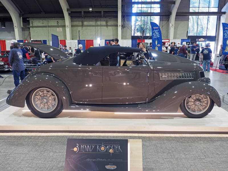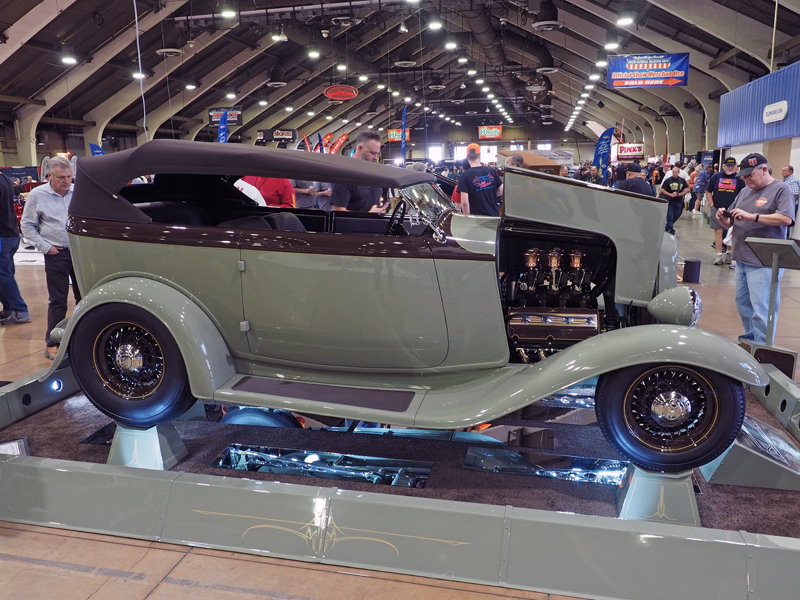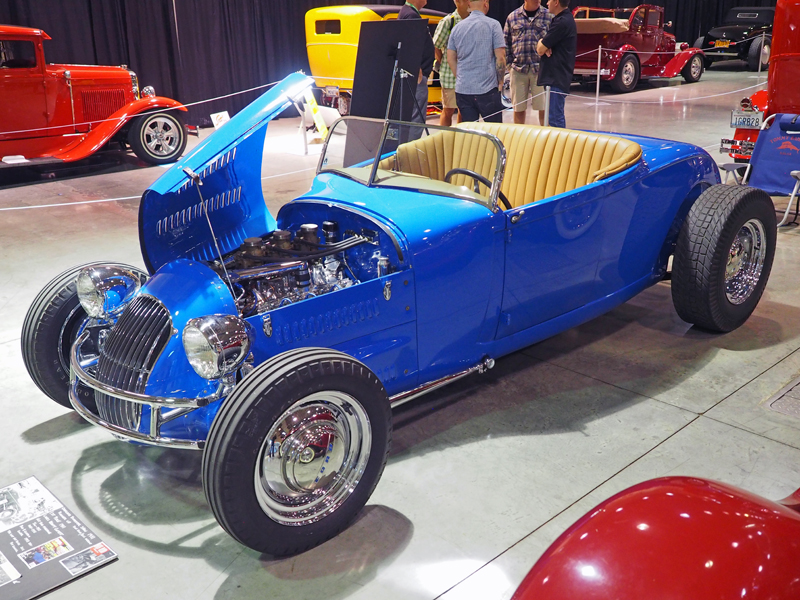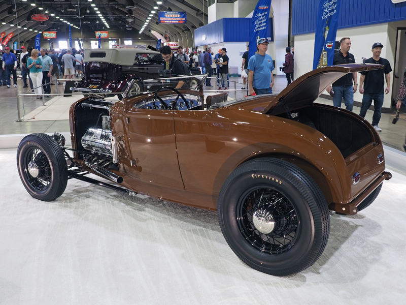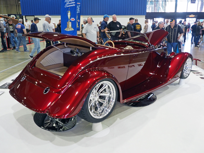 The Grand National Roadster Show, 2019David G. FoxAMBR CompetitionGeorge Poteet's Three Penny Roadster is the 2019 Grand National Roadster Show's America's Most Beautiful Roadster trophy winner. I'm sure there are many old-car guys, even some with a fair amount of knowledge about pre-war Fords, who will give this car a casual look and think, "great looking Ford." As is often the case in life, and especially with an AMBR winner, the devil is in the details. These pictures will only tell a little of the story (likewise, this text). The gist of it is: There may not be one part on this car that would fit a stock 1936 Ford. If you think the profile is handsome, and quite like a lowered '36 Ford, it is. But, the wheelbase has been stretched three inches, all of the new length dedicated to expanding the length of the cockpit. The grille shell leans back, via pulling it forward at the bottom, so the hood retains the original length. Correspondingly, the fenders, ahead of the front tires, have also been pulled forward. The windshield posts, which include a 2.5-inch cut, lay back ten degrees from stock, and the lower body line has been altered. If you think the car has a traditional appearance, it does. But, there is an untold number of custom-machined parts in it – billet, in other words. Examples come in expected places, and in others that are not. Some include those raked back windshield posts, hood side vents, running board inserts, head and tail light bezels, the steering wheel, dash trim, seat tracks, door hinges, body mounts, engine valve covers, radiator tanks, gas tank ends, etc., etc. Then there are those machined wheels, complicated knock-offs with somewhat obscured vents, created for this car by Mike Curtis. Custom modifications to the '36 sheet metal abound. The fenders have well defined peaks over their tops from end to end. The raked grille shell required re-fitment of the front of the hood and the area between the shell and the lengthened front fenders. Note the deck lid, which is described as "1939 style" and is cut out for the gas filler. Covered with upholstery, etc., perhaps every inner panel of the body is custom formed. There are partial belly pans underneath, sometimes in conjunction with compartments for electronics, fuel system components, and such. Plus, a glove box is accessable through a door in the floor. Those compartments nestle in areas between the hand-formed rails of the custom built frame. The frame mounts an independent front suspension and a Ford 351 Windsor engine/TKO 600 five-speed transmission combination, trailed by a Winters banjo rear end. But, enough of the details. Where did the name come from? Elsewhere on this website, it is observed that George Poteet is a patron of the art of hot rod design and construction. At this level it definitely is an art form. Noteable cars have been constructed for him at hot rod shops across the country. Some shop owners could say he established their careers. Word has it that George doesn't hover, doesn't micro-manage, rather he provides the genesis of an idea and the funds, then relenquishes control to let the builder create. Story goes that George visited Pinkee's Rod Shop, in Windsor, Colorado, after the car was painted. He asked what the color is, and was told by Mike Peratt, "chocolate milk." Then George related that when he was a kid, the cost of chocolate milk was only three cents. Hence, the Three Penny Roadster. By the way, Mike Peratt and his Pinkee's Rod Shop are already well established. Mike built a Ridler Award winner in 1998, is a past Grand National Roadster Show Builder of the Year, and is a member of the Detroit Autorama Circle of Champions Hall of Fame. What George and Mike have created with the Three Penny Roadster is a custom coach-crafted automobile in the hot rod idiom. If Mr. Poteet's AMBR winning roadster is a coach-crafted custom, then this darkest-of-blues blue roadster is a stripped-down, bare-bones race car, with every bit as much attention to detail, fit, and finish. And, it, too, has innumerable custom-made parts. The development of the H&M Tulsa Roadster was a collaboration of effort between race car fabricator Jackie Howerton (a Tulsa native) and Steve Moal. These two met when Steve came to the Indianapolis 500 in 1974 as a racing crew member. Documentation available at the display suggested that much of the design, engineering, and fabrication work on the car was completed by Mr. Howerton, with secondary fabrication and finish work completed at Steve Moal's shop in Oakland. The official registration tag listed the roadster as being owned (entered) by Steve Moal, but elsewhere in the documentation, the owner was listed as Bill Grimsley, a former sports car racer. When I used the phrase bare bones above, I meant it in a very positive and literal sense. Note the exposed frame rails and shrouded transmission running through the cockpit, with its minimal, purposeful upholstery by Sid Chavers. The floor of the cockpit is the belly pan, below the frame rails. The belly pan extends through the trunk area. Thus, the gas tank and entire rear axle and suspension are aerodynamically enclosed. Another item of note is the ribbed aluminum panel at the firewall. This bulkhead is actually a motor plate, securing the rear of the engine block. The small block Chevy, with vintage-style valve covers, was built by Chas Rose. Sherms Plating was credited for the bright work on the car. A tremendous amount of detail is found in and around the front suspension of the Tulsa Roadster. The chassis sits very low and the axle rides in front of the grille shell, lengthening the wheelbase. Custom fitted grille bars in the Deuce shell are sculpted for clearance behind the axle. Jewelry-like bits and pieces link the axle and shocks, the spindles and longitudinal torsion bars that are the springs, etc. Cory Taulbert, of Clarkston, Michigan, built his and Ashley Taulbert's 1932 Ford roadster. Cory had help from Vintage Col