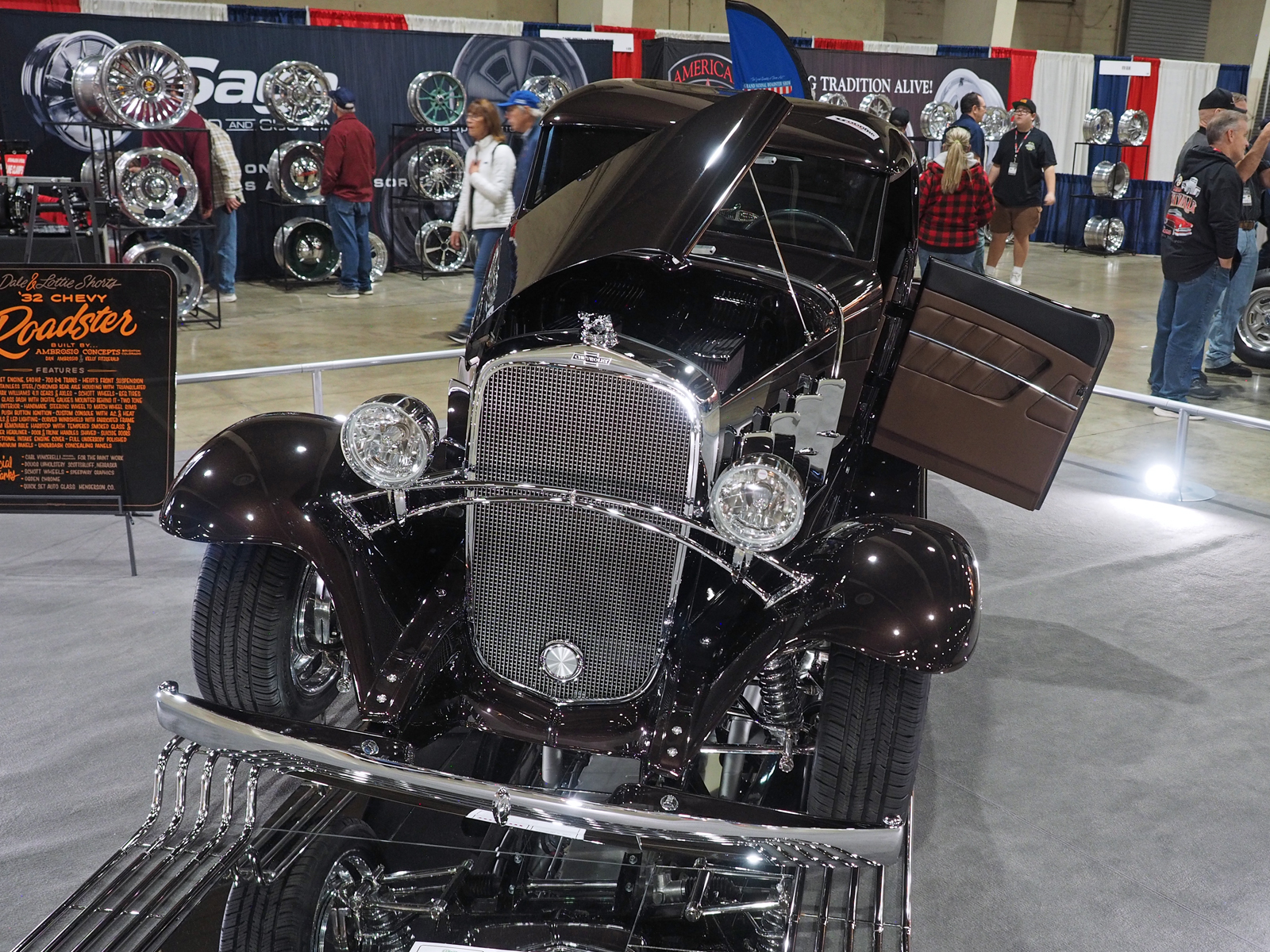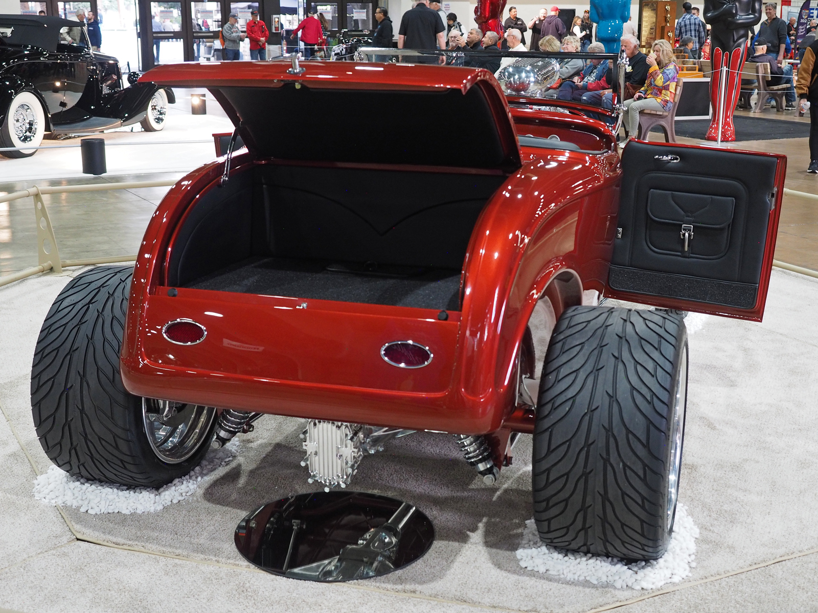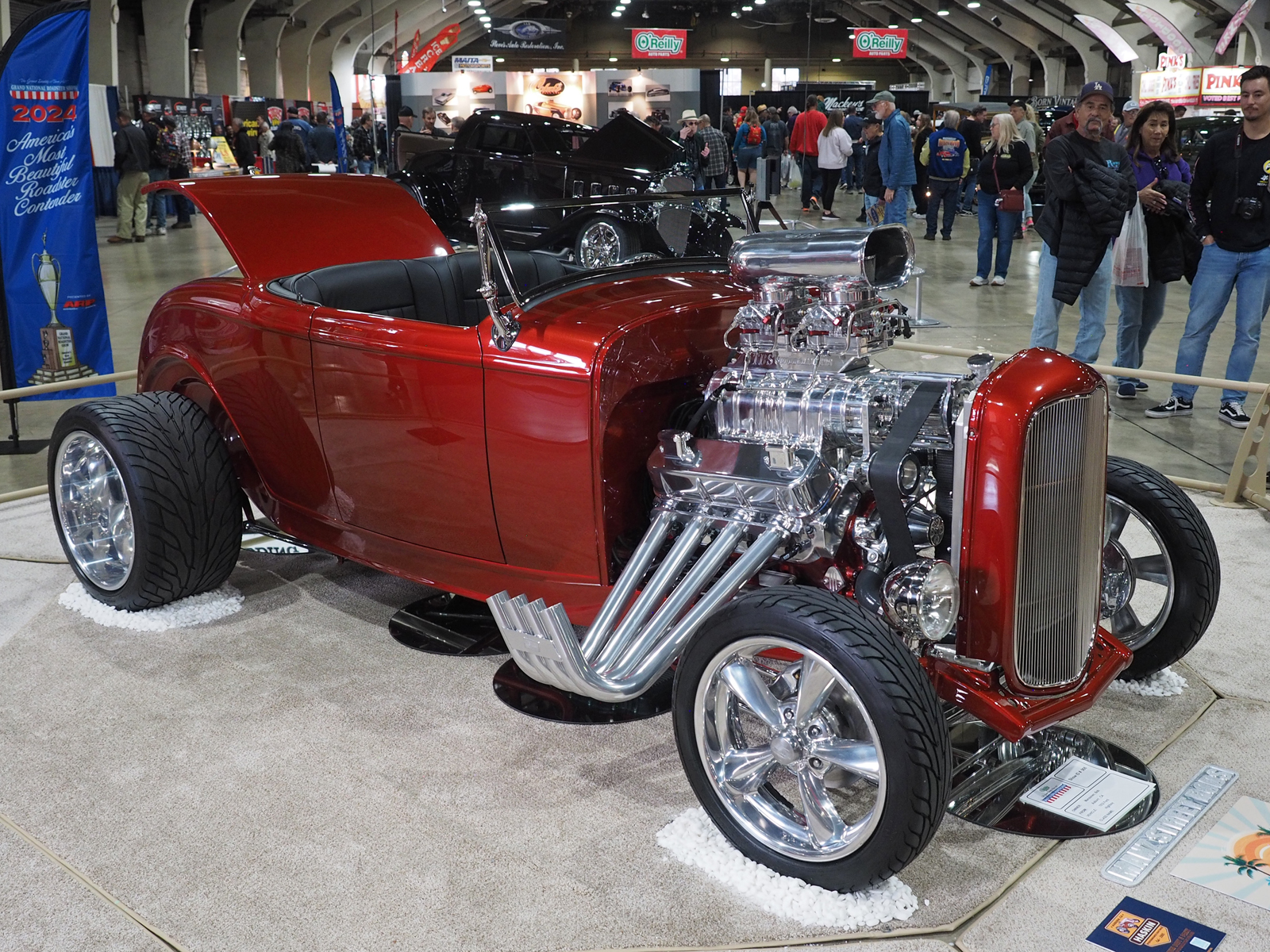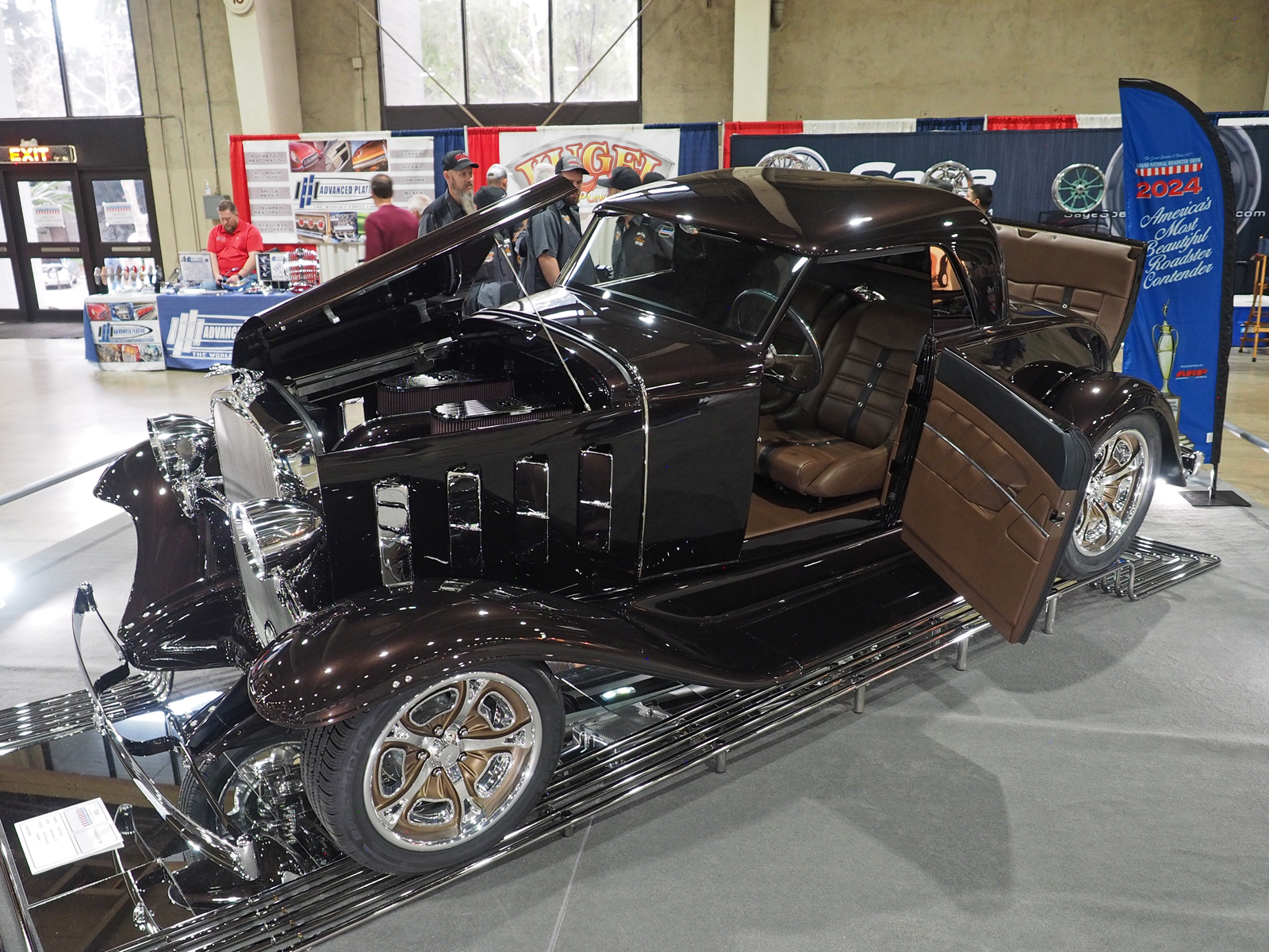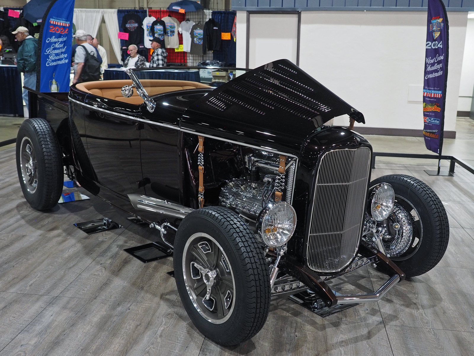 The Grand National Roadster Show, 2024David G. FoxAMBR CompetitionFor decades, flawless execution has been the hallmark of cars participating in the competition to be named America's Most Beautiful Roadster. This year there were nine entries. Phantom Phaetons It seems undeniable that the popularity of the 1932 Ford has reigned supreme and unwavering since they became financially available to hotrodders and since they began to be "fixed up" by early Ford V8 restorers. Certainly, Model Ts, Model As, Model 40s, etc., have always had their devotees, and will continue to do so. But the popularity of the Deuce has remained strong. And all of that seems to go double for the roadsters. Seven of nine AMBR contestants this year were '32 Fords, all but two were roadsters. Since the '32 was produced for only nine months and has always been so popular, the need for more "tin" spawned a reproduction market. From Dee Wescott's faithful and well-constructed fiberglass roadster bodies to the various modern steel panels and complete assemblies from Brookville Roadster, '32s continue to be pieced together or built all new. But what's a hotrodder to do with a need for a drive in a topless '32 Ford – sun on the face, wind in the hair, the rumble from a healthy V8 echoing from the back – and a desire to share that experience with more than one other person at a time? Throw in the fact that rodders have typically shied away from two too many doors. What to do? Ford's product line for 1930 and 1931 included, in addition to the standard four-door phaeton, a somewhat more elegantly turned out two-door open touring car called a Deluxe Phaeton. How about a '32 Deluxe Phaeton? Ford didn't make one. A few years ago, Brookville Roadster set out to do what Ford did not, and they enlisted the extraordinary talent of Chip Foose to design and build the prototype. A production run of 32 units was planned. On examination, you can tell that Chip borrowed from Brookville's existing '32 Ford body panel stash. One might liken the suicide door shape and fitment to a '33. But the cowl and door panels start with '32 three-window Deluxe Coupe stampings. Thus, there is continuity from the Model A days begging to refer to this new body style as a Deluxe Phaeton. These Brookville bodies were the outward visual basis for two contenders in the 2024 America's Most Beautiful Roadster competition Beth Myers, Skippack PA, 1932 Ford America's Most Beautiful Roadster Beth Myers' black, channeled two-door phaeton was built by the team at Roy Brizio Street Rods in South San Francisco. The foundation consists of: fully boxed frame rails, Moal torsion-bar suspension, Bell front axle, Winters Quick Change differential, and Johnson Hot Rod Shop Kinmont-style disk brakes. Under the hood is a fuel-injected Roush 427ci engine. Credits include: Vintage Color Studios for final body prep and paint, Sid Chavers for the interior, Sherm's Custom Plating, flames by Art Himsl, and pinstriping by Eric Reyes. The body on Beth's car received numerous nips and tucks – some mild cosmetic tweaks, others, such as the raised and re-radiused rear wheel wells, likely necessitated by the body being channeled over the frame. The rear of the body has been reshaped to be more like that of a two-door sedan. The windshield and top have been chopped three inches. Beth Myers' 2024 AMBR winner shouts hot rod, but is every bit as much the coach-build as any of the others in the field. Ken Reister, Littleton CO, 1932 Ford AMBR Outstanding Display, Paint, Interior As you can see, Ken chose a different approach to the look of his phaeton, which was built in his shop with finish work completed at Squeeg's Kustoms in Arizona. It's all quite elegant. Squeeg's was responsible for applying the Candy Apple Red over gold base paint, including subtle ghost painting (which, unfortunately, barely shows in the photographs). Other credits include: Reister's Rod Shop for the chassis, Recovery Room Hot Rod Interiors for the premium leather upholstery and wool carpet inside, Sid Chavers for the Hartz cloth top, and Custom Chrome for plating. Truespoke wire wheels are spun by a 340hp fuel-injected Ford 302 backed by a Ford 4R70 transmission. These two phantom phaetons are not the first to compete for the AMBR trophy. For the 2019 show, Gary Corkell used Brookville body number three in the construction of a full-fendered car powered by a 1953 DeSoto hemi engine. Reinforcing the potential of such bodies, Tom Sargis' bid for the AMBR that year was a '33 Ford Phaeton with a body converted to a two-door by Steve's Restorations. George Poteet's remarkable '36 Ford "3 Penny Roadster" was that year's AMBR winner. Also in 2019, Beth Myers' other '32 two-door phaeton (Brookville body number 2), was displayed in Brizio's area. An ultra-stock looker, complete with Washington Blue paint, black fenders, cream painted wire wheels, etc., it received a first-place finish in the Pre-1935 Touring Class. Full Kugel independent suspension belied the stock coach-built look of that beautiful car. Ken and Tina Thurm, Orange CA, 1932 Ford Ford Coyote engine with Gurney Weslake fuel injection Ramin and Karla Younessi, Fort Collins CO, 1934 Ford AMBR Outstanding Engine "The Throwback" sports a 255ci Mercury flathead, four James Butler, Prescott AZ, 1932 Ford Gary Holyoak, Cedar City UT, 1932 Ford H&H Best Dressed Flathead Mekenzie Murphy, Loveland OH, 1932 Ford AMBR Outstanding Detail, Engineering, Undercarriage Bob Mansonin, Auburn CA, 1932 Ford Dale and Lottie Short, Henderson CO, 1932 Chevrolet Jack Chisenhall, San Antonio TX, 1932 Ford 2023 America's Most Beautiful Roadster Bill Lindig, Pomona CA, 1927 Ford 2012 America's Most Beautiful Roadster Al Slonaker Memorial AwardThe Al Slonaker Memorial Award competition works much like the AMBR competition. The difference is that the cars can be anything but roadsters. Here is a quick look at the 2024 Slonaker contestants. David Rush, Oklahoma City OK, 1959 Chevrolet Al 