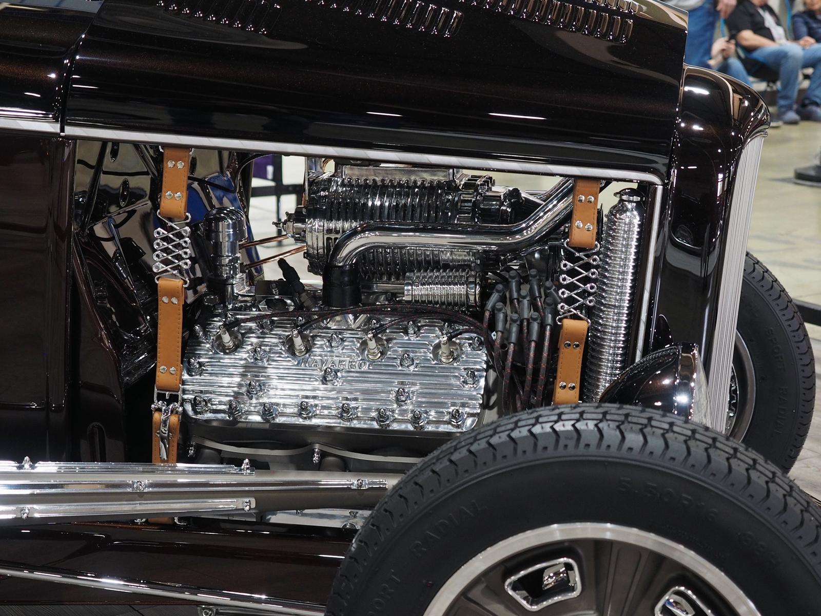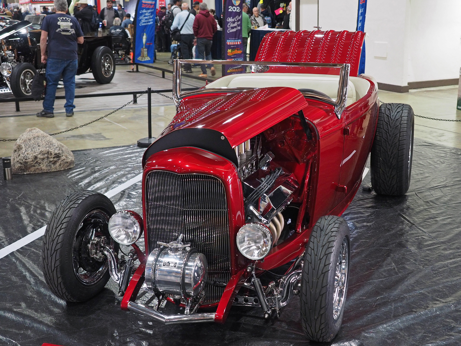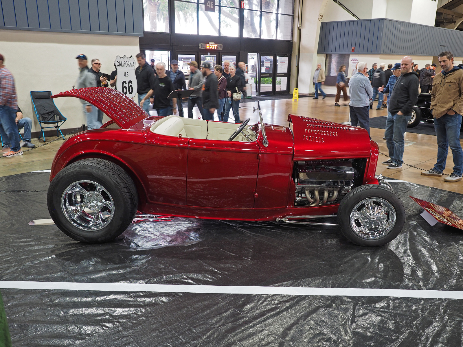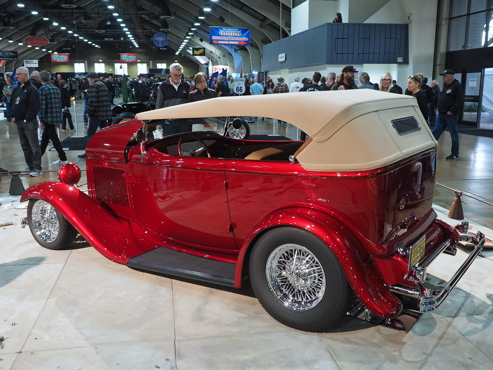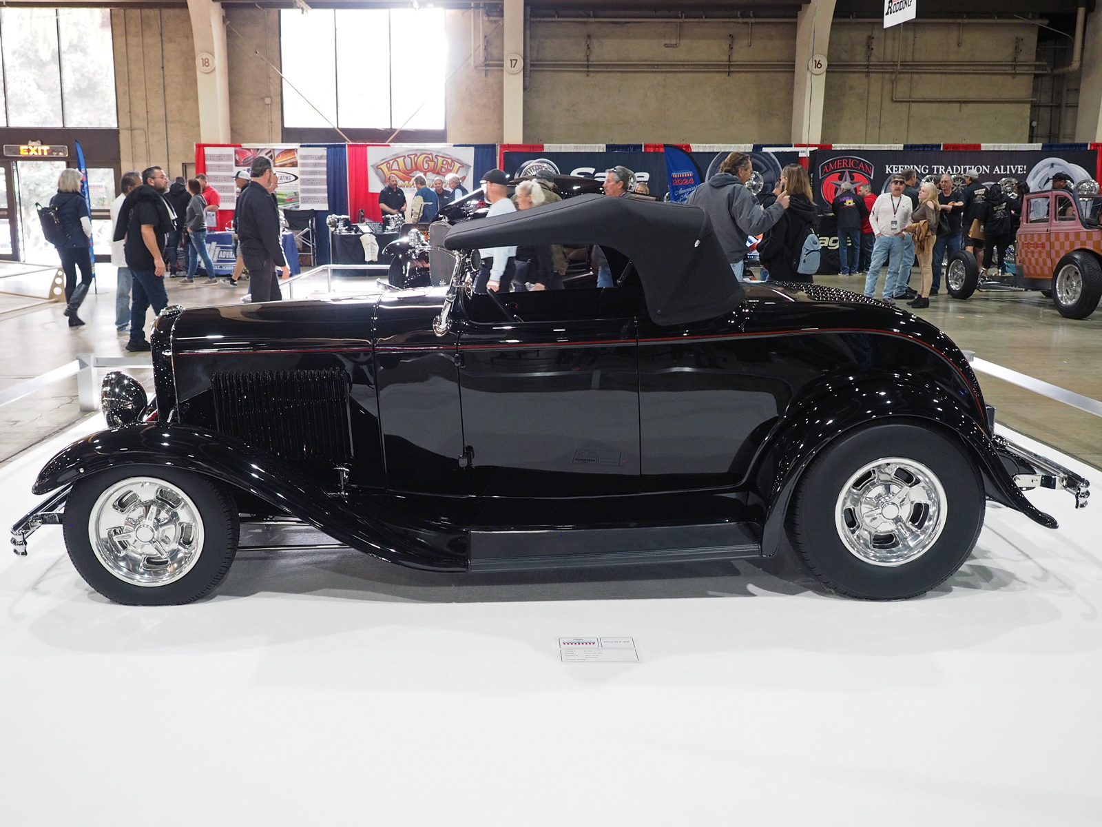 The Grand National Roadster Show, 2024David G. FoxAMBR CompetitionFor decades, flawless execution has been the hallmark of cars participating in the competition to be named America's Most Beautiful Roadster. This year there were nine entries. Phantom Phaetons It seems undeniable that the popularity of the 1932 Ford has reigned supreme and unwavering since they became financially available to hotrodders and since they began to be "fixed up" by early Ford V8 restorers. Certainly, Model Ts, Model As, Model 40s, etc., have always had their devotees, and will continue to do so. But the popularity of the Deuce has remained strong. And all of that seems to go double for the roadsters. Seven of nine AMBR contestants this year were '32 Fords, all but two were roadsters. Since the '32 was produced for only nine months and has always been so popular, the need for more "tin" spawned a reproduction market. From Dee Wescott's faithful and well-constructed fiberglass roadster bodies to the various modern steel panels and complete assemblies from Brookville Roadster, '32s continue to be pieced together or built all new. But what's a hotrodder to do with a need for a drive in a topless '32 Ford – sun on the face, wind in the hair, the rumble from a healthy V8 echoing from the back – and a desire to share that experience with more than one other person at a time? Throw in the fact that rodders have typically shied away from two too many doors. What to do? Ford's product line for 1930 and 1931 included, in addition to the standard four-door phaeton, a somewhat more elegantly turned out two-door open touring car called a Deluxe Phaeton. How about a '32 Deluxe Phaeton? Ford didn't make one. A few years ago, Brookville Roadster set out to do what Ford did not, and they enlisted the extraordinary talent of Chip Foose to design and build the prototype. A production run of 32 units was planned. On examination, you can tell that Chip borrowed from Brookville's existing '32 Ford body panel stash. One might liken the suicide door shape and fitment to a '33. But the cowl and door panels start with '32 three-window Deluxe Coupe stampings. Thus, there is continuity from the Model A days begging to refer to this new body style as a Deluxe Phaeton. These Brookville bodies were the outward visual basis for two contenders in the 2024 America's Most Beautiful Roadster competition Beth Myers, Skippack PA, 1932 Ford America's Most Beautiful Roadster Beth Myers' black, channeled two-door phaeton was built by the team at Roy Brizio Street Rods in South San Francisco. The foundation consists of: fully boxed frame rails, Moal torsion-bar suspension, Bell front axle, Winters Quick Change differential, and Johnson Hot Rod Shop Kinmont-style disk brakes. Under the hood is a fuel-injected Roush 427ci engine. Credits include: Vintage Color Studios for final body prep and paint, Sid Chavers for the interior, Sherm's Custom Plating, flames by Art Himsl, and pinstriping by Eric Reyes. The body on Beth's car received numerous nips and tucks – some mild cosmetic tweaks, others, such as the raised and re-radiused rear wheel wells, likely necessitated by the body being channeled over the frame. The rear of the body has been reshaped to be more like that of a two-door sedan. The windshield and top have been chopped three inches. Beth Myers' 2024 AMBR winner shouts hot rod, but is every bit as much the coach-build as any of the others in the field. Ken Reister, Littleton CO, 1932 Ford AMBR Outstanding Display, Paint, Interior As you can see, Ken chose a different approach to the look of his phaeton, which was built in his shop with finish work completed at Squeeg's Kustoms in Arizona. It's all quite elegant. Squeeg's was responsible for applying the Candy Apple Red over gold base paint, including subtle ghost painting (which, unfortunately, barely shows in the photographs). Other credits include: Reister's Rod Shop for the chassis, Recovery Room Hot Rod Interiors for the premium leather upholstery and wool carpet inside, Sid Chavers for the Hartz cloth top, and Custom Chrome for plating. Truespoke wire wheels are spun by a 340hp fuel-injected Ford 302 backed by a Ford 4R70 transmission. These two phantom phaetons are not the first to compete for the AMBR trophy. For the 2019 show, Gary Corkell used Brookville body number three in the construction of a full-fendered car powered by a 1953 DeSoto hemi engine. Reinforcing the potential of such bodies, Tom Sargis' bid for the AMBR that year was a '33 Ford Phaeton with a body converted to a two-door by Steve's Restorations. George Poteet's remarkable '36 Ford "3 Penny Roadster" was that year's AMBR winner. Also in 2019, Beth Myers' other '32 two-door phaeton (Brookville body number 2), was displayed in Brizio's area. An ultra-stock looker, complete with Washington Blue paint, black fenders, cream painted wire wheels, etc., it received a first-place finish in the Pre-1935 Touring Class. Full Kugel independent suspension belied the stock coach-built look of that beautiful car. Ken and Tina Thurm, Orange CA, 1932 Ford Ford Coyote engine with Gurney Weslake fuel injection Ramin and Karla Younessi, Fort Collins CO, 1934 Ford AMBR Outstanding Engine "The Throwback" sports a 255ci Mercury flathead, four James Butler, Prescott AZ, 1932 Ford Gary Holyoak, Cedar City UT, 1932 Ford H&H Best Dressed Flathead Mekenzie Murphy, Loveland OH, 1932 Ford AMBR Outstanding Detail, Engineering, Undercarriage Bob Mansonin, Auburn CA, 1932 Ford Dale and Lottie Short, Henderson CO, 1932 Chevrolet Jack Chisenhall, San Antonio TX, 1932 Ford 2023 America's Most Beautiful Roadster Bill Lindig, Pomona CA, 1927 Ford 2012 America's Most Beautiful Roadster Al Slonaker Memorial AwardThe Al Slonaker Memorial Award competition works much like the AMBR competition. The difference is that the cars can be anything but roadsters. Here is a quick look at the 2024 Slonaker contestants. David Rush, Oklahoma City OK, 1959 Chevrolet Al 