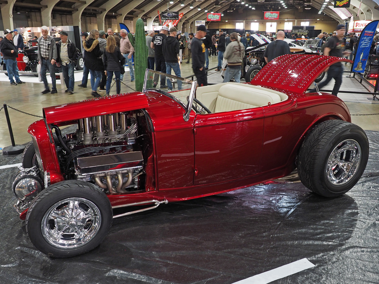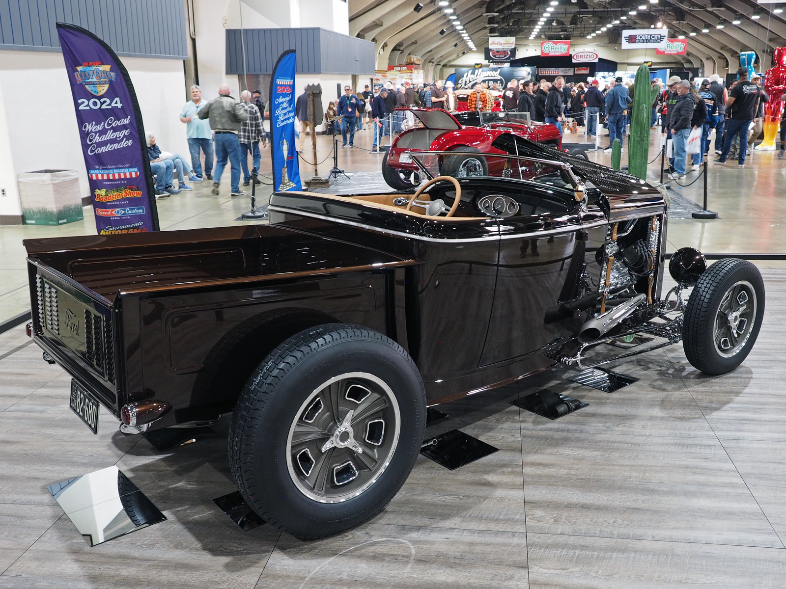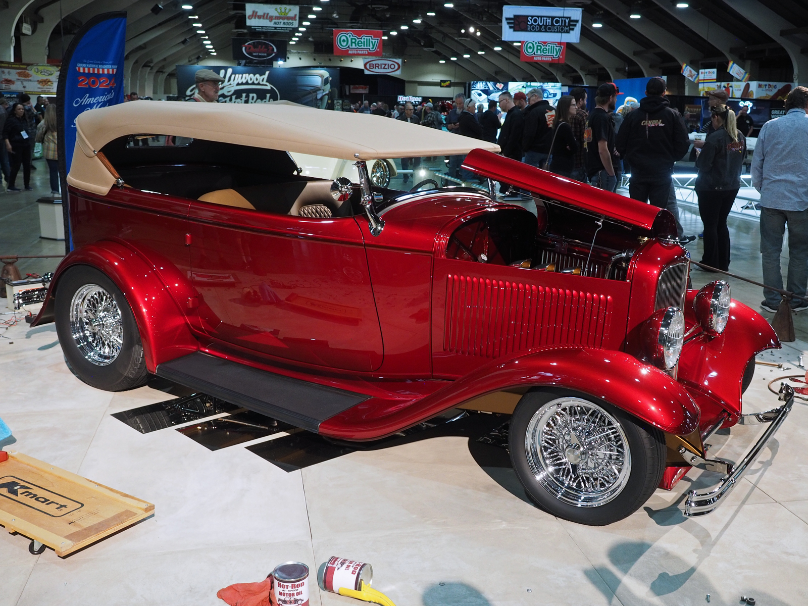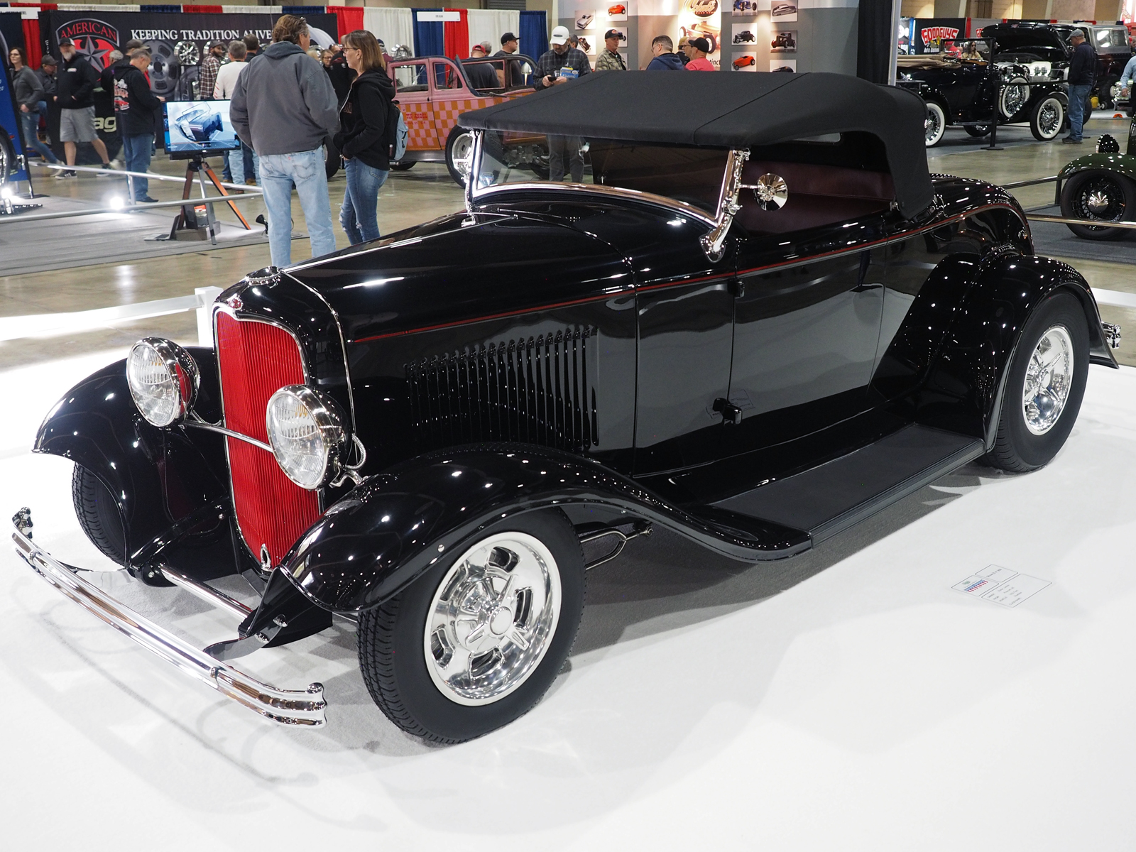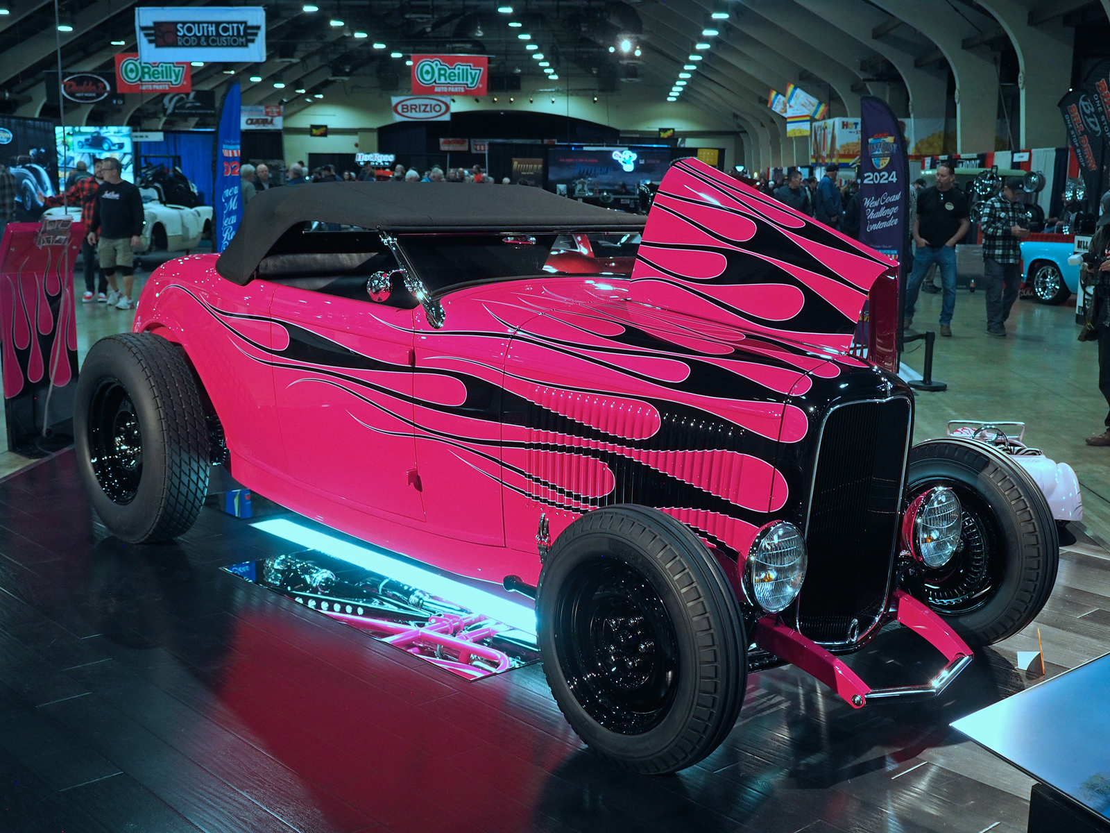 The Grand National Roadster Show, 2024David G. FoxAMBR CompetitionFor decades, flawless execution has been the hallmark of cars participating in the competition to be named America's Most Beautiful Roadster. This year there were nine entries. Phantom Phaetons It seems undeniable that the popularity of the 1932 Ford has reigned supreme and unwavering since they became financially available to hotrodders and since they began to be "fixed up" by early Ford V8 restorers. Certainly, Model Ts, Model As, Model 40s, etc., have always had their devotees, and will continue to do so. But the popularity of the Deuce has remained strong. And all of that seems to go double for the roadsters. Seven of nine AMBR contestants this year were '32 Fords, all but two were roadsters. Since the '32 was produced for only nine months and has always been so popular, the need for more "tin" spawned a reproduction market. From Dee Wescott's faithful and well-constructed fiberglass roadster bodies to the various modern steel panels and complete assemblies from Brookville Roadster, '32s continue to be pieced together or built all new. But what's a hotrodder to do with a need for a drive in a topless '32 Ford – sun on the face, wind in the hair, the rumble from a healthy V8 echoing from the back – and a desire to share that experience with more than one other person at a time? Throw in the fact that rodders have typically shied away from two too many doors. What to do? Ford's product line for 1930 and 1931 included, in addition to the standard four-door phaeton, a somewhat more elegantly turned out two-door open touring car called a Deluxe Phaeton. How about a '32 Deluxe Phaeton? Ford didn't make one. A few years ago, Brookville Roadster set out to do what Ford did not, and they enlisted the extraordinary talent of Chip Foose to design and build the prototype. A production run of 32 units was planned. On examination, you can tell that Chip borrowed from Brookville's existing '32 Ford body panel stash. One might liken the suicide door shape and fitment to a '33. But the cowl and door panels start with '32 three-window Deluxe Coupe stampings. Thus, there is continuity from the Model A days begging to refer to this new body style as a Deluxe Phaeton. These Brookville bodies were the outward visual basis for two contenders in the 2024 America's Most Beautiful Roadster competition Beth Myers, Skippack PA, 1932 Ford America's Most Beautiful Roadster Beth Myers' black, channeled two-door phaeton was built by the team at Roy Brizio Street Rods in South San Francisco. The foundation consists of: fully boxed frame rails, Moal torsion-bar suspension, Bell front axle, Winters Quick Change differential, and Johnson Hot Rod Shop Kinmont-style disk brakes. Under the hood is a fuel-injected Roush 427ci engine. Credits include: Vintage Color Studios for final body prep and paint, Sid Chavers for the interior, Sherm's Custom Plating, flames by Art Himsl, and pinstriping by Eric Reyes. The body on Beth's car received numerous nips and tucks – some mild cosmetic tweaks, others, such as the raised and re-radiused rear wheel wells, likely necessitated by the body being channeled over the frame. The rear of the body has been reshaped to be more like that of a two-door sedan. The windshield and top have been chopped three inches. Beth Myers' 2024 AMBR winner shouts hot rod, but is every bit as much the coach-build as any of the others in the field. Ken Reister, Littleton CO, 1932 Ford AMBR Outstanding Display, Paint, Interior As you can see, Ken chose a different approach to the look of his phaeton, which was built in his shop with finish work completed at Squeeg's Kustoms in Arizona. It's all quite elegant. Squeeg's was responsible for applying the Candy Apple Red over gold base paint, including subtle ghost painting (which, unfortunately, barely shows in the photographs). Other credits include: Reister's Rod Shop for the chassis, Recovery Room Hot Rod Interiors for the premium leather upholstery and wool carpet inside, Sid Chavers for the Hartz cloth top, and Custom Chrome for plating. Truespoke wire wheels are spun by a 340hp fuel-injected Ford 302 backed by a Ford 4R70 transmission. These two phantom phaetons are not the first to compete for the AMBR trophy. For the 2019 show, Gary Corkell used Brookville body number three in the construction of a full-fendered car powered by a 1953 DeSoto hemi engine. Reinforcing the potential of such bodies, Tom Sargis' bid for the AMBR that year was a '33 Ford Phaeton with a body converted to a two-door by Steve's Restorations. George Poteet's remarkable '36 Ford "3 Penny Roadster" was that year's AMBR winner. Also in 2019, Beth Myers' other '32 two-door phaeton (Brookville body number 2), was displayed in Brizio's area. An ultra-stock looker, complete with Washington Blue paint, black fenders, cream painted wire wheels, etc., it received a first-place finish in the Pre-1935 Touring Class. Full Kugel independent suspension belied the stock coach-built look of that beautiful car. Ken and Tina Thurm, Orange CA, 1932 Ford Ford Coyote engine with Gurney Weslake fuel injection Ramin and Karla Younessi, Fort Collins CO, 1934 Ford AMBR Outstanding Engine "The Throwback" sports a 255ci Mercury flathead, four James Butler, Prescott AZ, 1932 Ford Gary Holyoak, Cedar City UT, 1932 Ford H&H Best Dressed Flathead Mekenzie Murphy, Loveland OH, 1932 Ford AMBR Outstanding Detail, Engineering, Undercarriage Bob Mansonin, Auburn CA, 1932 Ford Dale and Lottie Short, Henderson CO, 1932 Chevrolet Jack Chisenhall, San Antonio TX, 1932 Ford 2023 America's Most Beautiful Roadster Bill Lindig, Pomona CA, 1927 Ford 2012 America's Most Beautiful Roadster Al Slonaker Memorial AwardThe Al Slonaker Memorial Award competition works much like the AMBR competition. The difference is that the cars can be anything but roadsters. Here is a quick look at the 2024 Slonaker contestants. David Rush, Oklahoma City OK, 1959 Chevrolet Al 